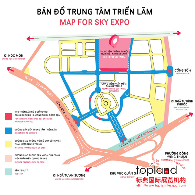 一、私家車和出租車可直接到達展館,廣忠軟件園可提供停車設施,可以通過谷歌地圖搜到地址:Quang Trung Software Park, Công Viên Ph?n M?m, Quang Trung, Tân H?ng Thu?n, Qu?n 12, Thành ph? H? Chí Minh .