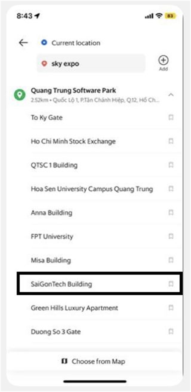 二、可使用當地的出行交通工具如Grab 或 GoViet,可通過手機下載APP進行使用,搜索“廣忠軟件園(Quang Trung Software Park)”,然后選擇“西貢科技大廈(Saigon Tech Building)”作為離入口較近的下車點。