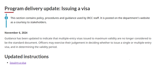 加拿大官網于2024年11月6日發布的簽證