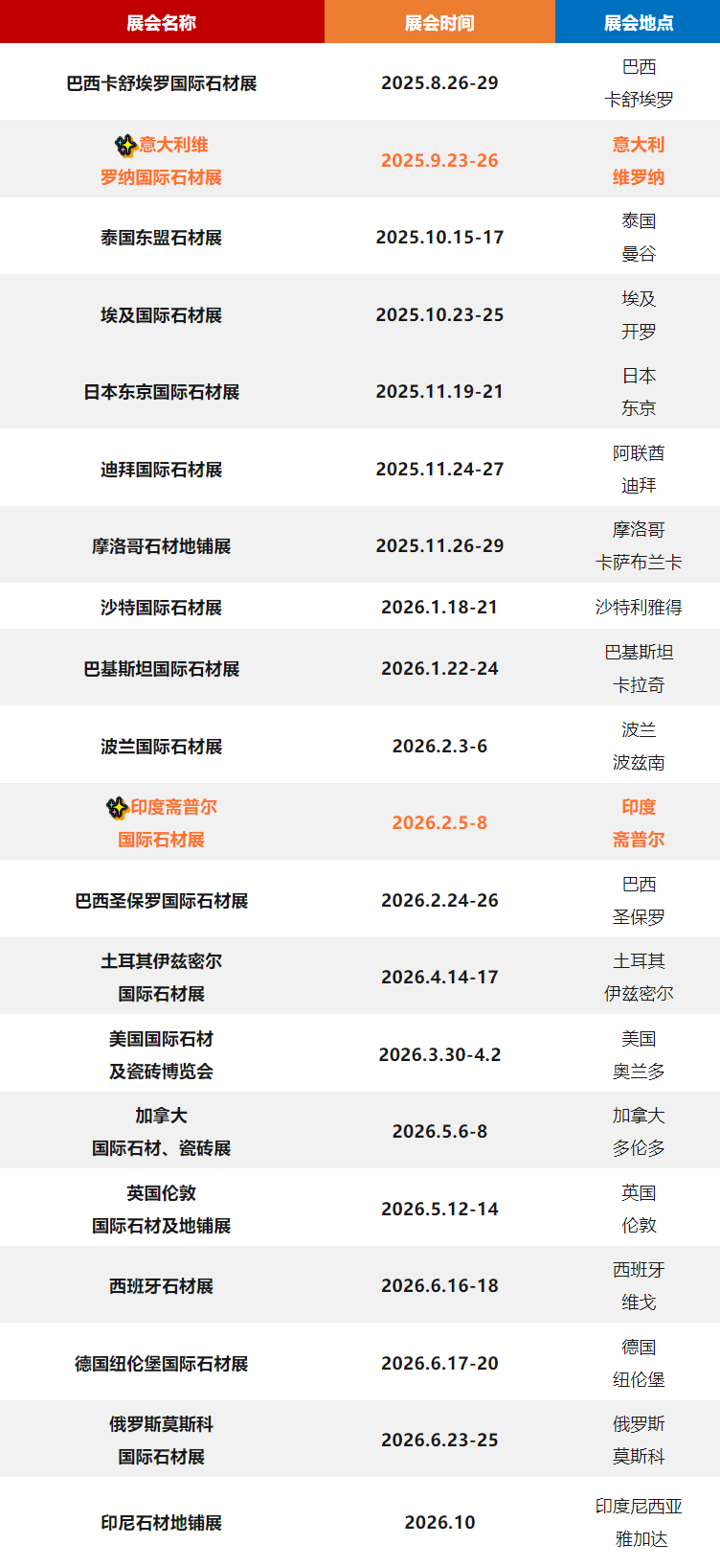 2025 - 2026 年全球石材展會版圖已就位!從巴西卡舒埃羅開啟石材之旅,意大利維羅納、泰國曼谷等多地接力 。涵蓋石材全品類,從基礎(chǔ)石材到地鋪、瓷磚關(guān)聯(lián)品類 。無論你是石材企業(yè)拓展海外市場,還是采購商尋覓優(yōu)質(zhì)資源,在巴西圣保羅看行業(yè)前沿,去美國奧蘭多探跨界融合 。不同國家展會各有特色,精準(zhǔn)對接全球石材產(chǎn)業(yè)鏈,跟著這份排期,奔赴一場場石材行業(yè)的國際盛宴,搶占全球市場先機!