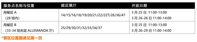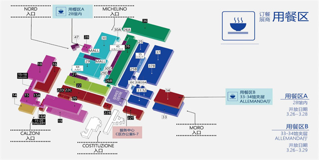 中國展商專屬用餐區(qū):主辦方在展會布展及開展日期間,為中國參展商準備了2個用餐區(qū),為了中國企業(yè)的整體參展形象,注意請不要在展位內(nèi)用餐。