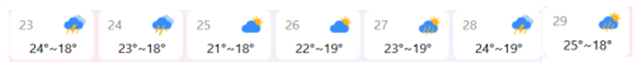 在臺(tái)期間:平最高氣溫18℃,最低氣溫24℃。溫度適宜。